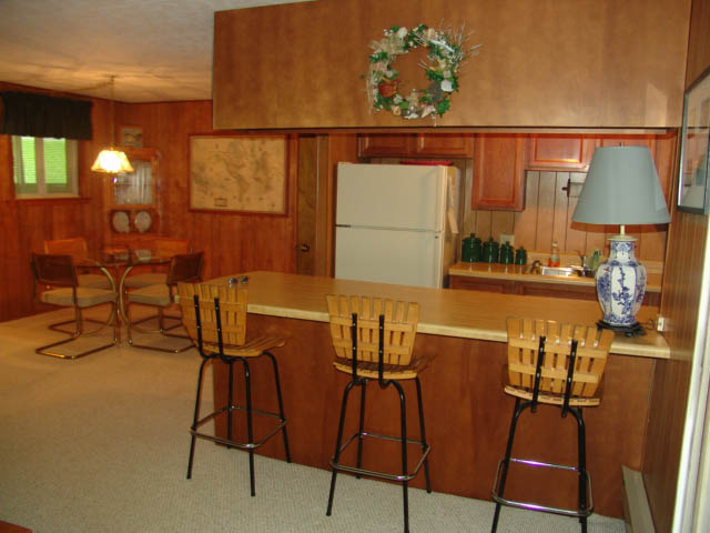 Waterfront Ranch has a Living Room with gas log fireplace, Dining