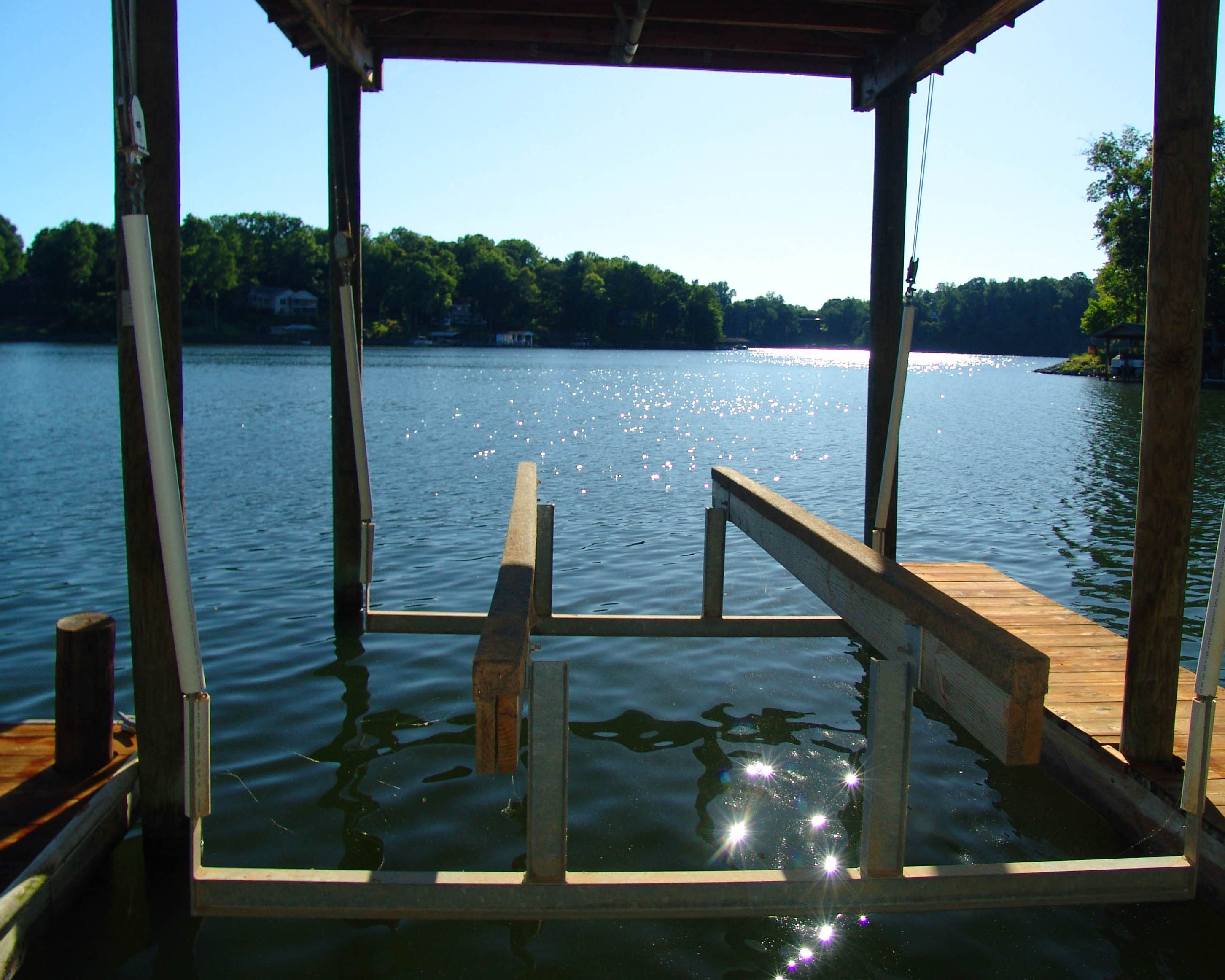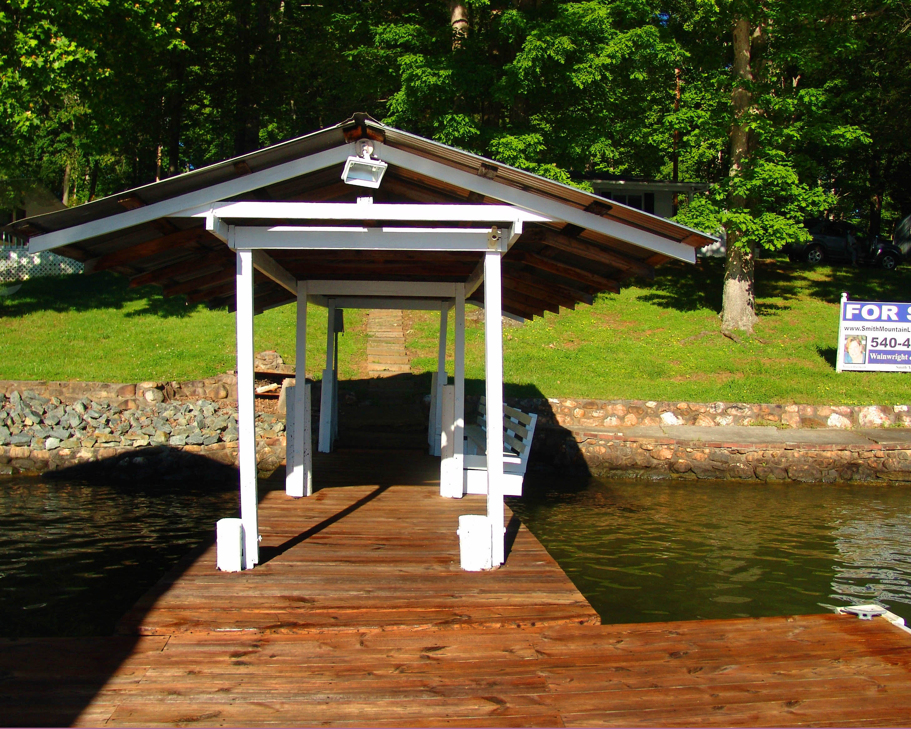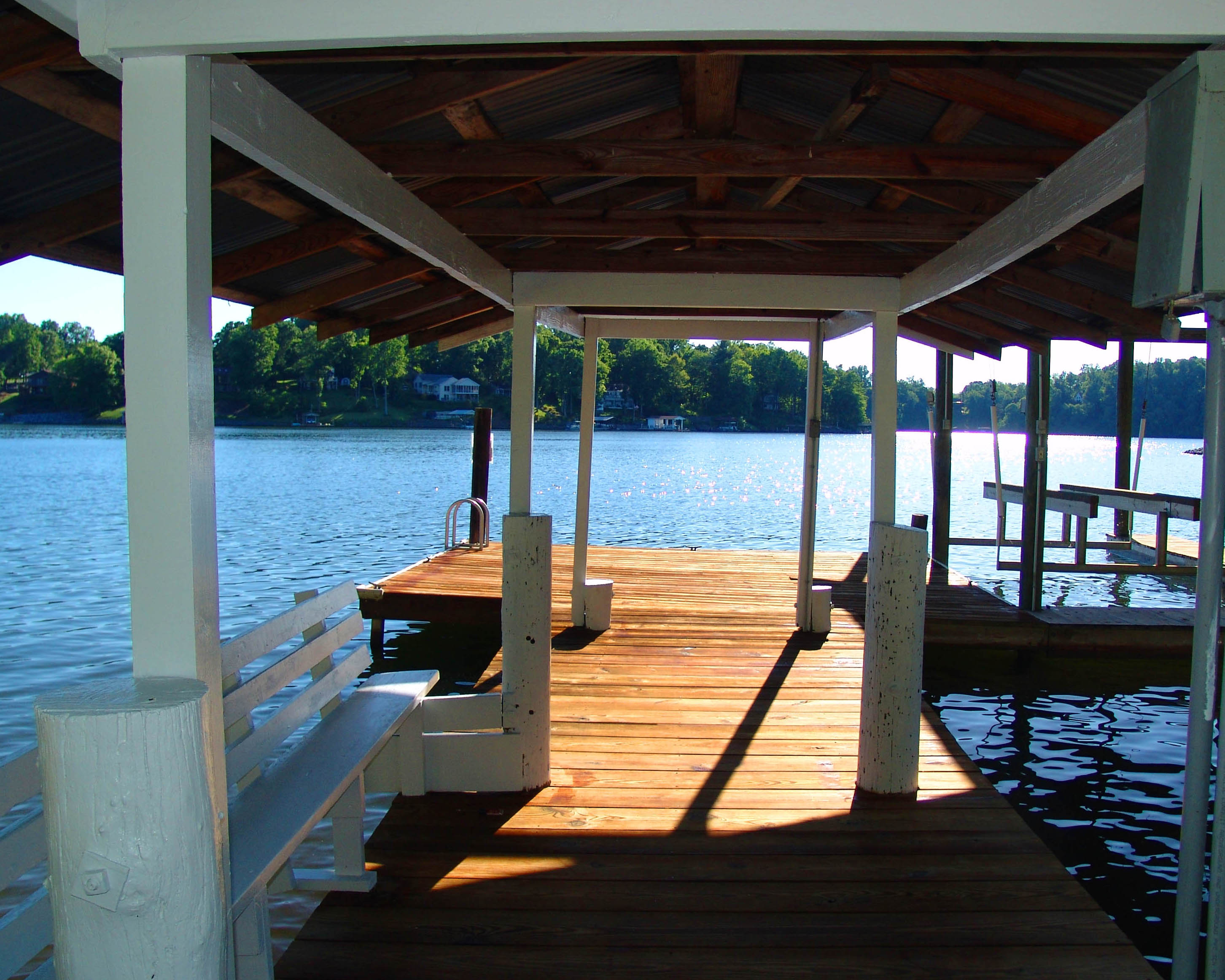 shed, large dock with single slip and boat hoist, shaded sitting area with park bench,