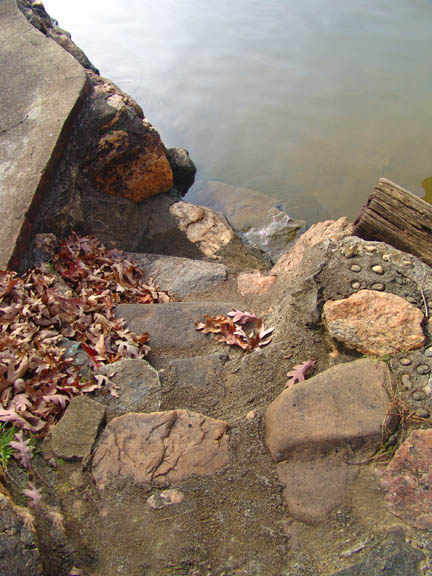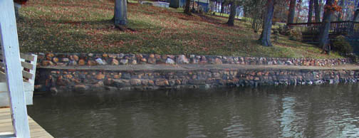 lakeside fireplace, fieldstone & quartz seawall w/ stone